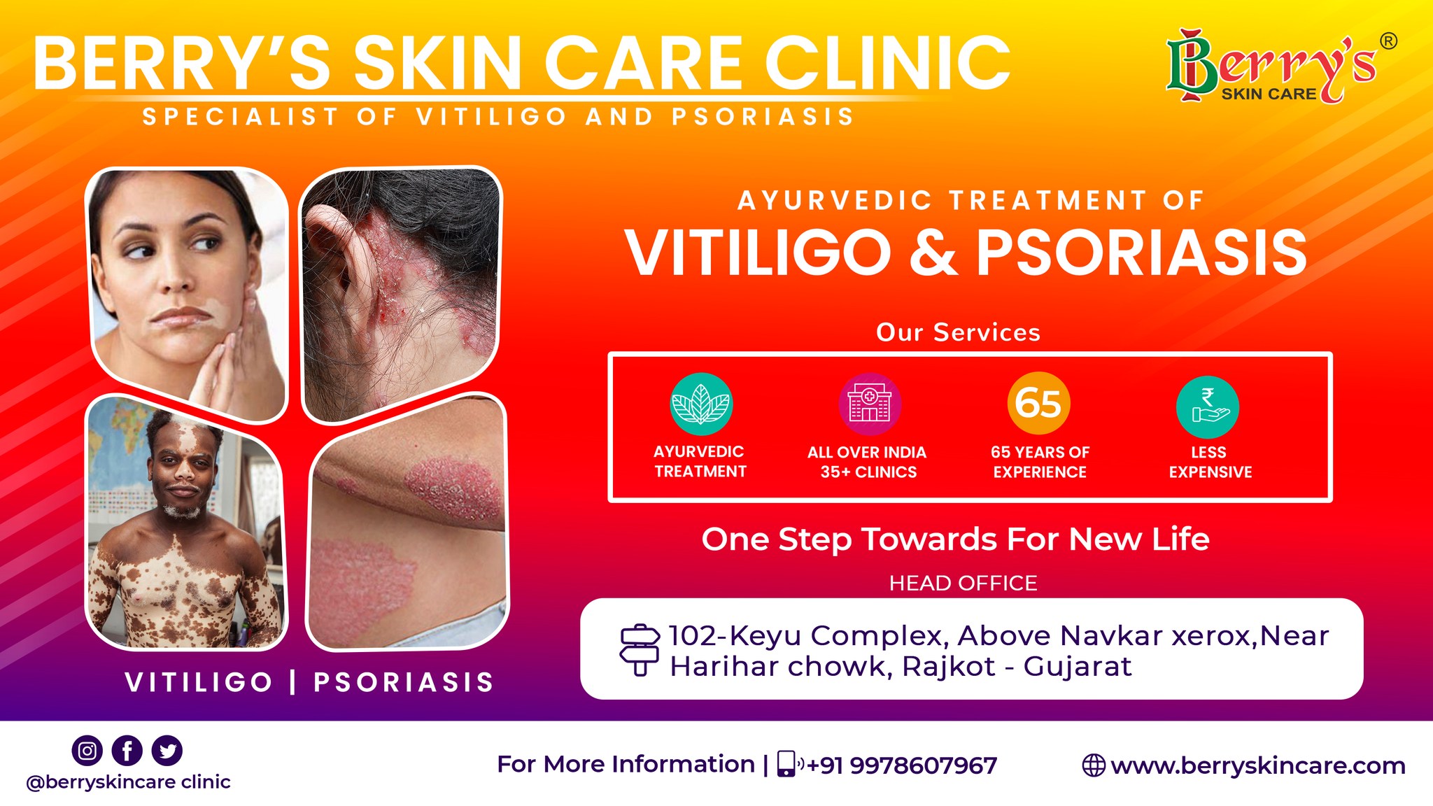 Berry Skin Care is a leading skin care clinic in Gujarat, known for its specialised Ayurvedic treatment of skin conditions like vitiligo and psoriasis. With over two decades of experience, the clinic offers effective, herbal-based therapies that are safe, side-effect-free, and backed by years of research. Their unique Leuco Kit and Psoria Kit are widely recognised for promoting long-lasting healing.